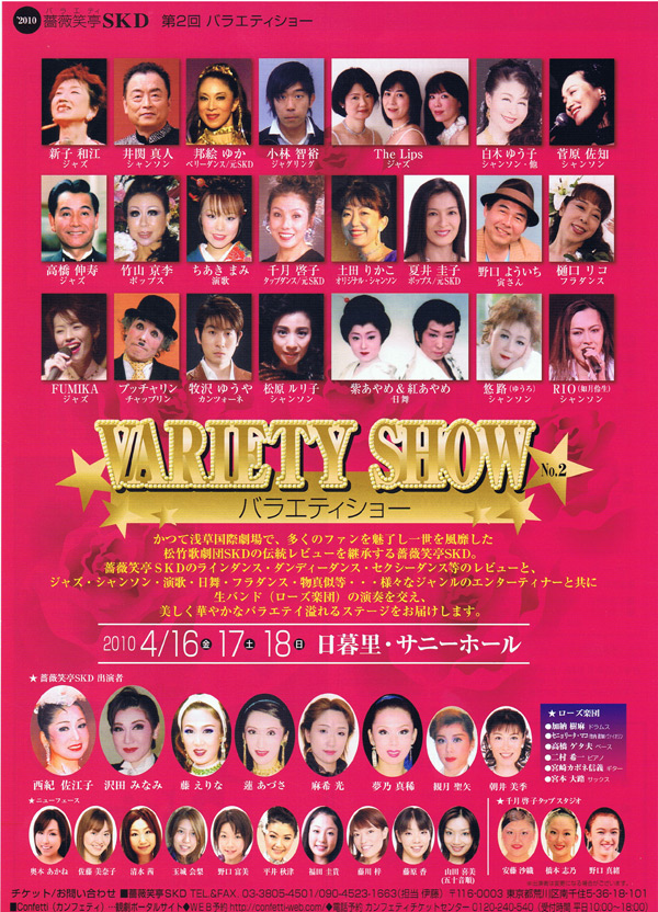 薔薇笑亭SKDの華麗なレビューショー、素敵なゲストの方々の唄、ダンス、巧みな技もご覧いただけます。